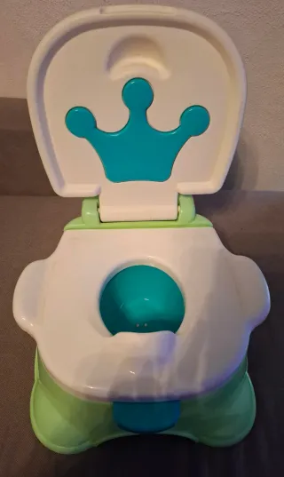 Orinal infantil con un divertido diseño de corona en la tapa. Es de color blanco y verde, con detalles en azul. Cuando el bebé hace pipi o caca suena una melodía.