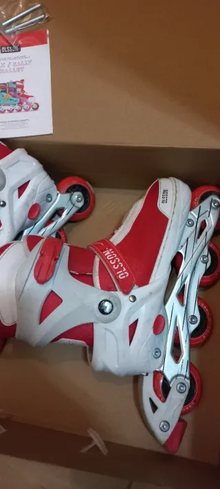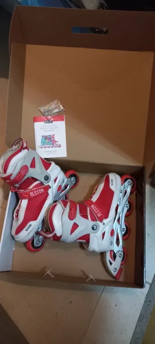 Se venden patines en línea de la marca Olsson en colores rojo y blanco. Incluyen manual. Talla 36 amplia a talla 39. - Diseño deportivo. - Cierre de velcro y hebilla. - Ruedas de poliuretano.