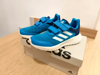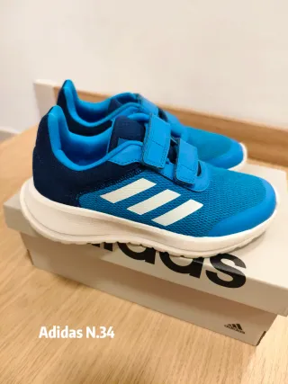 Zapatillas deportivas para niño de la marca Adidas en talla 34. Sólo una puesta de un rato. Cuentan con un diseño moderno y práctico. -Flexibles y no pesan. - Cierre de velcro. - Tres franjas blancas características de la marca. - Parte superior de malla transpirable..