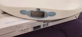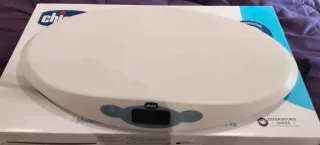 Balanza digital Chicco para bebés. Su diseño es blanco y ovalado, con una pantalla digital en el centro. - Pantalla digital. - Diseño ovalado.
