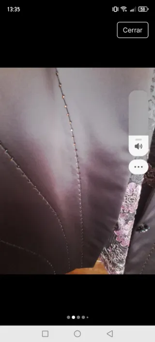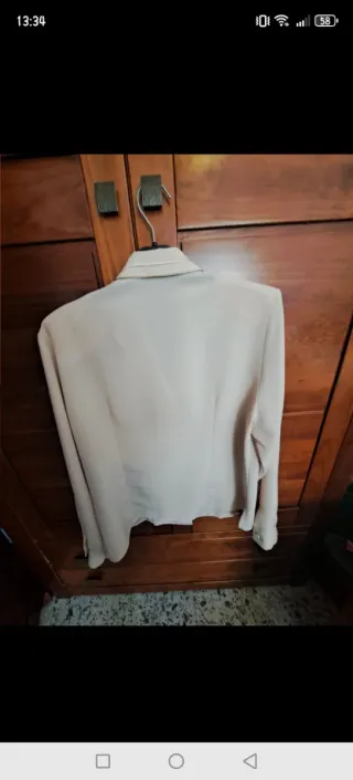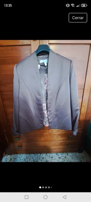 Conjunto de blazer y top, ideal para eventos especiales. El blazer es de color marrón satinado y el top tiene un delicado estampado floral. - Blazer con costuras decorativas. - Top con detalles de encaje floral.u
