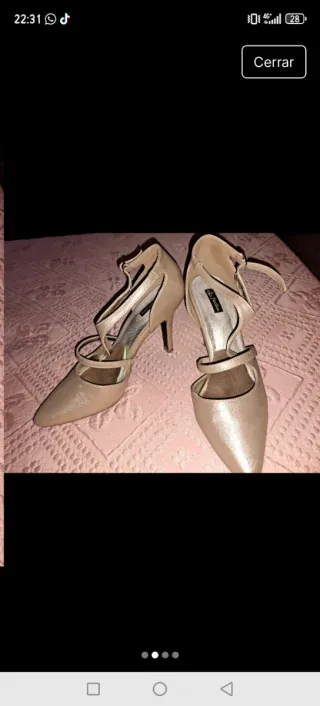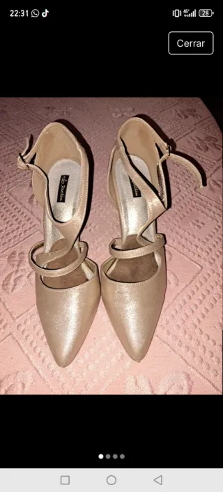 Elegantes zapatos de tacón en color dorado, perfectos para ocasiones especiales. Tienen un diseño con tiras cruzadas y pulsera al tobillo. - Acabado brillante. - Punta fina. - Tira de tobillo ajustable.