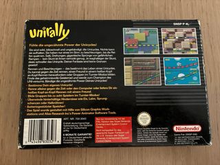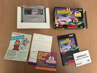 Videojuego Unirally para Super Nintendo (SNES) en su versión PAL. Incluye la caja original, el cartucho y los manuales. - Caja original con diseño llamativo. - Cartucho del juego. - Manual de instrucciones. - Folleto del Club Nintendo.