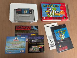 Cartucho de Super Mario World para Super Nintendo (SNES) en su versión PAL, completo con su caja original e instrucciones. - Caja original. - Manual de instrucciones. - Folleto Club Nintendo. - Folleto GIG Electronics.