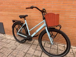 Bicicleta estilo holandés en color azul claro, con cesta delantera y portabultos trasero. - Cesta de plástico color marrón. - Portabultos trasero negro. - Sillín y puños marrones luz trasera 3 velocidades freno contra pedal se puede entregar dependiendo el sitio