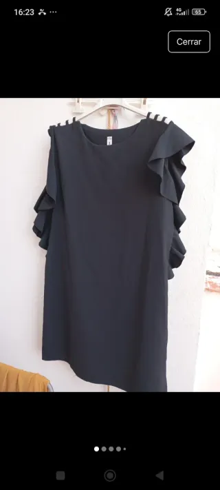Vestido negro con un diseño moderno y elegante. - Mangas con volantes. - Detalles en los hombros. Ideal para cualquier evento ,talla única talla equivale a 40