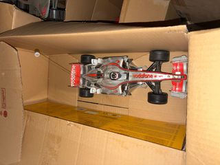 Coche teledirigido a escala con diseño inspirado en el equipo Vodafone McLaren. - Réplica detallada del coche de carreras. - Colores plateado, rojo y negro. - Neumáticos de goma.
