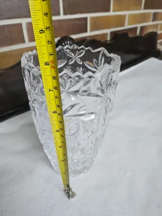 Elegante jarrón de cristal con un intrincado diseño tallado que aporta un toque de sofisticación a cualquier espacio. - Diseño tallado con motivos florales. - Acabado transparente.
