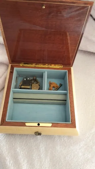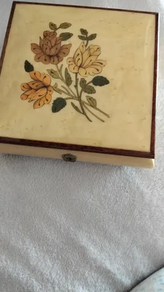 Elegante joyero musical de origen italiano con un precioso diseño floral.años 90 en perfecto estado - Decoración de flores en tonos beige y marrón. - Acabado de madera pulida. - Cierre metálico decorativo.