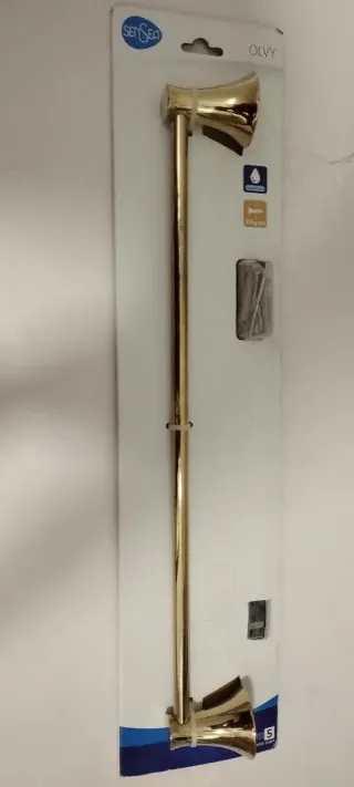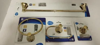 Set de accesorios para el baño en acabado dorado. Todos los elementos son nuevos y vienen en su empaque original. - Incluye toallero de barra, toallero de aro, y portarrollos. - Fabricados en metal resistente.