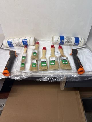 Se vende lote de material de pintura, ideal para trabajos de bricolaje o profesionales. - Incluye dos rodillos de pintura. - Incluye siete brochas de diferentes tamaños. Cuatro Batas de polipropileno blanco con cierre velcro. - Los rodillos y brochas vienen empaquetados individualmente. -Las batas de polipropileno vienen empaquetadas individualmente en su bolsa de plástico sellada