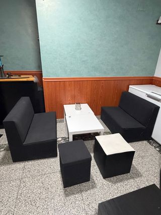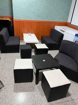 Conjunto de mobiliario para sala de estar o zona comun. - Sofás blanco 2 - Sofás negros 3 - Sofas curvos negros 2 - mesas bajas 5 - puffs 6