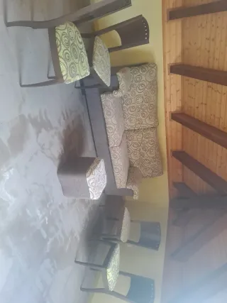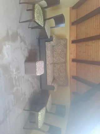 Conjunto de mobiliario para sala de estar, incluye sofá, sillas y un reposapiés. - Sofá con cojines estampados. - 4 sillas a juego. - Reposapiés a juego con el sofá y las sillas.