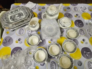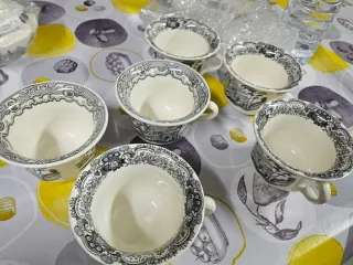 Conjunto de vajilla del modelo Vistas Negra de La Cartuja de Sevilla.modelo 201 años 2000 - Diseño clásico con detalles en negro. - Piezas de porcelana. - Incluye 6 platos desayuno ,6 tazas desayuno 1 taza esta mellada, cafetera ,azucarero y lechera. Y set de 3 fuentes Todo nuevo sin estrenar en sus embalajes originales Una de las tazas tiene una pequeña mella y ha sido en el transporte
