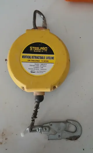 Dispositivo anticaída retráctil vertical marca Steelpro. - Modelo: 1888-B10 - Diámetro del cable: 4.8mm - Longitud: 10M - Número de serie: 16A0202 - Certificación EN 360:2002
