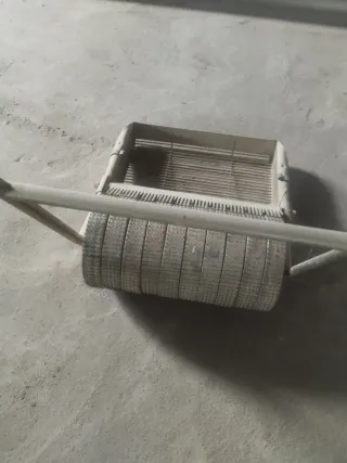 Herramienta para recoger aceitunas caídas del suelo. - Fabricado en metal. - Diseño con rodillo y rejilla.con depósito para las aceitunas