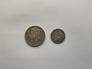 Dos monedas antiguas de pesetas de España, datan del siglo XVIII. Piezas de colección. - Una moneda de 5 pesetas. - Una moneda de 2 pesetas.