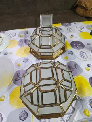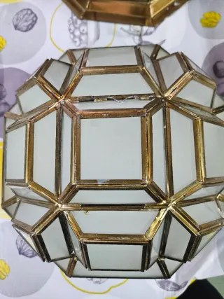 Set de dos apliques o plafones de estilo granadino. Su diseño geométrico aporta un toque distintivo. - Estructura metálica con detalles dorados. - Paneles de cristal translúcido. Con Espejo en el fondo decoración árabe Hago envíos están perfectos