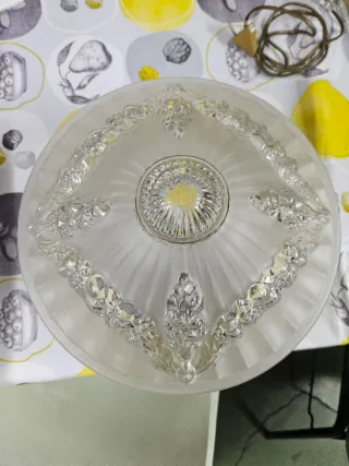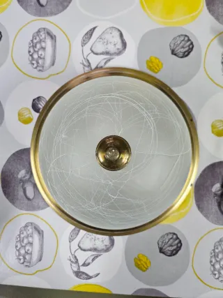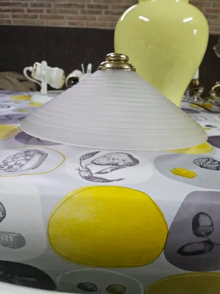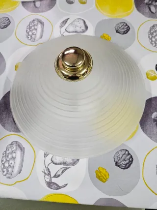 Elegante plafón de cristal con detalles metálicos dorados, diseñado para ser instalado en el techo. - Diseño cónico con acabado texturizado. - Base y remate superior en metal dorado. En perfecto estado