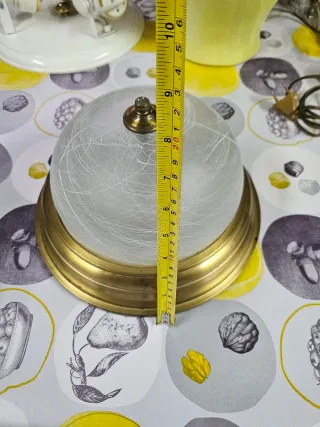 Lámpara de mesa vintage con un diseño inspirado en los años 70. Su forma y color la convierten en una pieza decorativa única. - Base de cerámica con acabado brillante. - Detalles metálicos en la parte superior. - Cable de alimentación incluido. Ginger jar