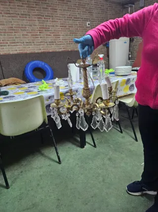 Elegante lámpara de techo estilo araña, con detalles en bronce y cristal. - Diseño clásico y ornamentado. - Cristales colgantes que aportan brillo. - Estructura principal en bronce. 4 brazos