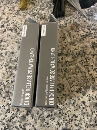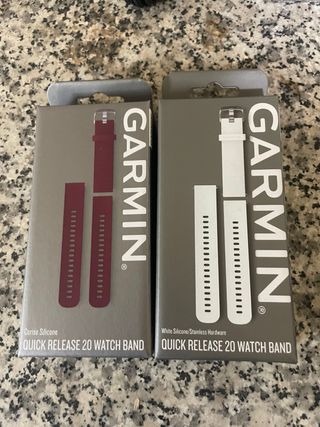 Dos correas de repuesto para reloj Garmin, de liberación rápida. - Correa de silicona color Cerise. - Correa de silicona color Blanco con herrajes de acero inoxidable. - Tamaño de 20 mm.