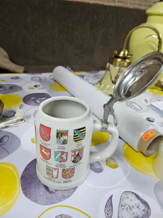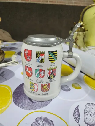 Jarra de cerveza alemana con un diseño tradicional y tapa de peltre metálica. - Fabricada en cerámica de alta calidad. - Presenta escudos de diferentes regiones alemanas. - El asa es ergonómica para un buen agarre. como Bremen, Baviera y Sajonia. Las tapas de las jarras se originaron históricamente durante la Peste Negra para proteger la bebida de insectos y enfermedades. Cada pieza es única, hecha y pintada a mano en Alemania, y a menudo numerada para coleccionistas. Se considera una obra de arte alemana