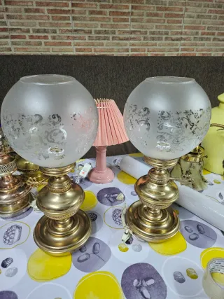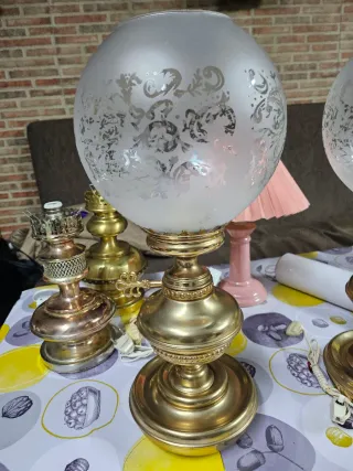 Elegante lámpara de mesa de estilo vintage, con una base y detalles en latón o bronce. Su pantalla esférica de cristal translúcido presenta un delicado diseño decorativo. - Base y cuerpo de metal con acabado dorado. - Pantalla de cristal esmerilado con motivos ornamentales.
