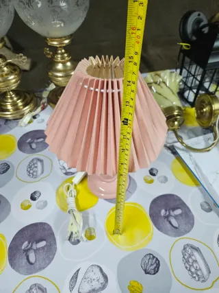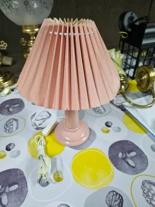 Elegante lámpara de mesa con un diseño clásico y encantador. - Pantalla plisada en tono rosa. - Base de plástico. - Cable con interruptor.
