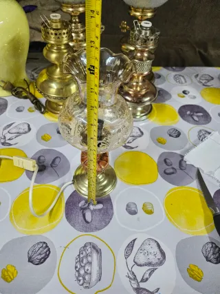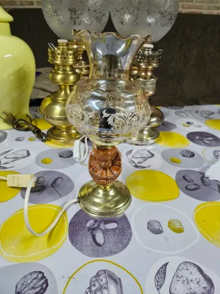 Elegante lámpara de mesa con base de latón y un detalle decorativo en la parte central. - Pantalla de cristal con motivos grabados. - Base metálica dorada. - Detalle central con figura. - Cable de alimentación incluido.