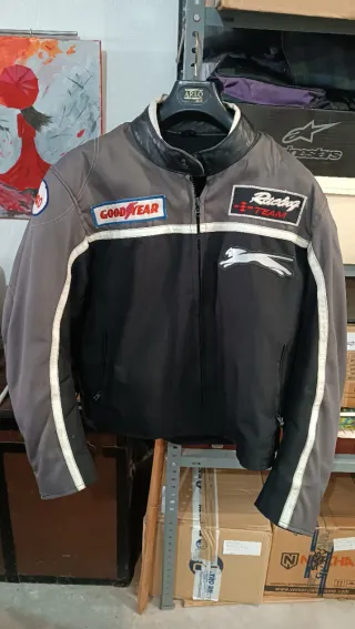 Cazadora de moto con diseño deportivo. - Parches de Goodyear y Racing Team. - Detalle de felino en el pecho. - Combinación de colores gris, negro y blanco. - Cuello de cuero.