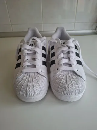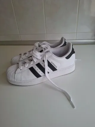 Clásicas zapatillas Adidas Superstar en color blanco con las icónicas tres franjas negras. - Cierre con cordones. - Punta reforzada. - Suela de goma. - Solo se han usado una vez