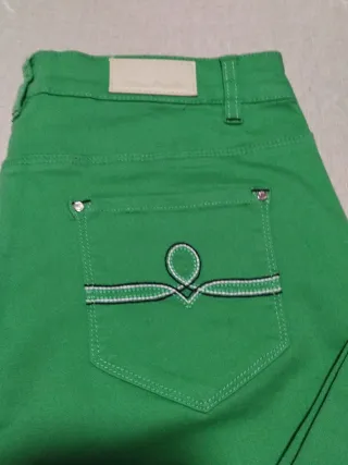 Pantalones pirata de la marca Cortefiel en color azul marino. Cuentan con un diseño moderno y detalles de tachuelas. - Talla: [Añadir talla] - Cierre: Cremallera y botón - Bolsillos: [Especificar número y tipo de bolsillos] - Adorno: Tachuelas doradas en la parte delantera