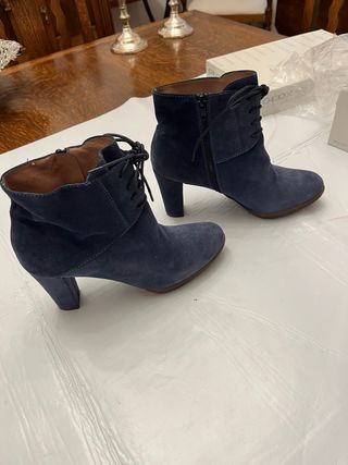 Botines de ante en color azul con tacón medio. - Cierre con cremallera lateral. - Detalle de cordones en la parte delantera. - Material exterior: ante. - Forro interior de piel.