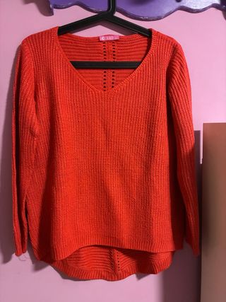 Jersey de punto en color coral, ideal para añadir un toque vibrante a tu armario. - Diseño de manga larga. - Cuello en V con detalle de puntadas. - Mas largo por detrás.