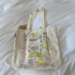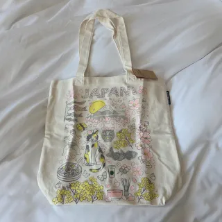 Bolsa de tela con diseño inspirado en Japón y la flor de cerezo. - Ilustraciones de elementos japoneses. - Estampado de flores de cerezo. - Color base beige con detalles en rosa.