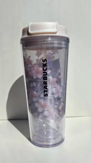 Vaso reutilizable de Starbucks Japan con un hermoso diseño de Sakura (flor de cerezo). - Diseño floral en tonos rosas y morados. - Tapa con cierre seguro. - Material transparente.