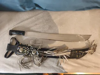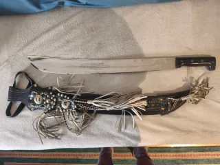 Sable conmemorativo de 1974. Incluye funda de cuero decorada. - Hoja de acero pulido. - Empuñadura negra. - Funda de cuero con flecos y adornos metálicos.