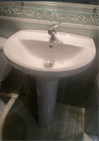 Lavabo de diseño clásico Victoria de Roca, con pedestal y grifo incluido. El lavabo mide 56 cm de ancho, y 46 cm de fondo. La altura del lavabo de aproximadamente 15 cm. El pie del lavabo mide 68 cm de alto.