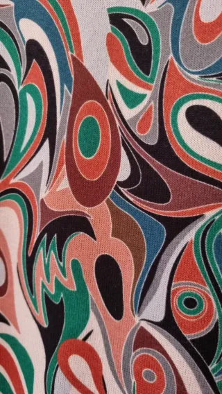 Vestido de manga larga con cuello alto y un llamativo estampado. - Diseño con cuello tipo cisne. - Estampado abstracto en tonos vibrantes. - Corte recto y cómodo.