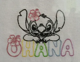 Precioso cuadro bordado con el personaje de Stitch y la palabra Ohana. - Diseño de Stitch con flores. - Bordado Ohana multicolor. - Marco de madera con textura, medidas 13x18cm.