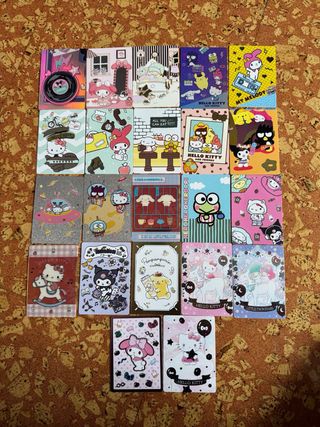 Conjunto de 22 cartas o tarjetas coleccionables de Hello Kitty y sus amigos. - Diseños variados con personajes como My Melody, Cinnamoroll, Keroppi y más. - Incluye imágenes de Hello Kitty en diferentes escenarios y atuendos. - Algunas tarjetas presentan diseños brillantes o con detalles especiales. Se admiten ofertas por separado