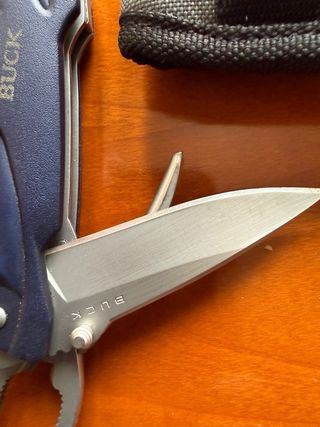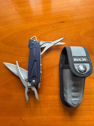 Navaja multiusos de la prestigiosa marca Buck, ideal para diversas tareas. Incluye su funda. - Diseño compacto y funcional. - Materiales resistentes. 1.- Hoja con muesca para apertura con una mano. 2.- Alicates. 3.- Tijeras. 4.- Destornillador de estrella. 5.- Destornillador normal. 6.- Lima para afilar. 7.- Funda para cinturon