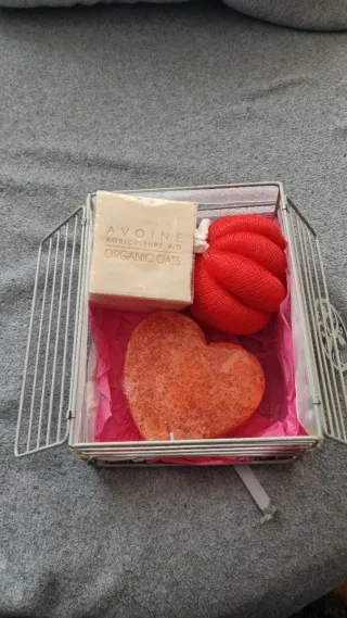 Conjunto de regalo perfecto para San Valentín. - Jabón con avena - Esponja de ducha en forma de corazón. - Incluye una esponja de baño roja.
