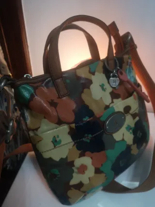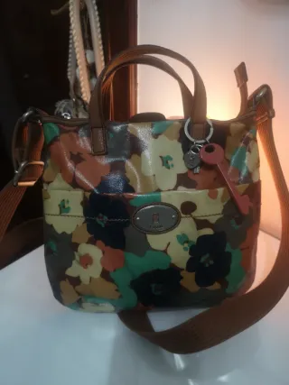 Bolso de la marca Fossil con un estampado floral vibrante. Es un accesorio versátil que se puede llevar como bolso de mano o bandolera. - Estampado floral multicolor., plastificado - Cierre de cremallera. - Incluye llavero con forma de llave. - Correa ajustable.