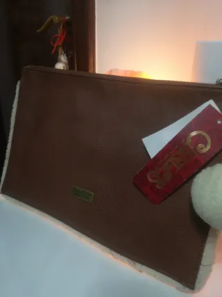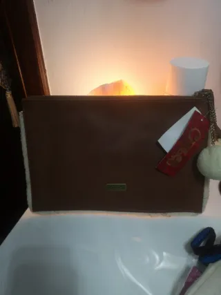Elegante bolso de mano en color marrón. - Acabado en piel sintética. - Detalle de pelo en los laterales. - Incluye etiqueta de marca.