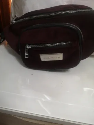 Bandolera de terciopelo en color granate. - Cierre con cremallera. - Bolsillo frontal con cremallera. - Detalle de placa metálica.
