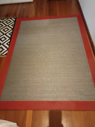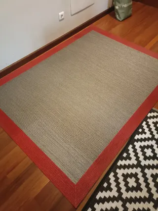 Alfombra vinílica con un diseño moderno y elegante. - Borde de color rojo. - Textura tejida. Medidas 1,50x2metros
