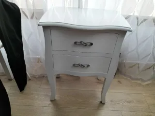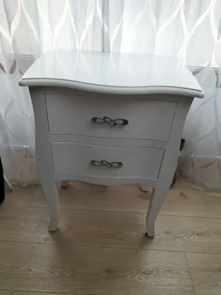 Elegante mesita de noche con un diseño clásico y acabados cuidados. - Dos cajones con tiradores decorativos. - Patas curvas que le dan un toque de estilo. - Superficie superior con un ligero borde curvo. Cómoda Medidas aproximadamente 52x36x72 alto
