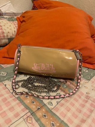 Bolso cilíndrico con cadena. - Diseño brillante. - Detalle de cadena metálica con eslabones rosas. - Cierre de cremallera.